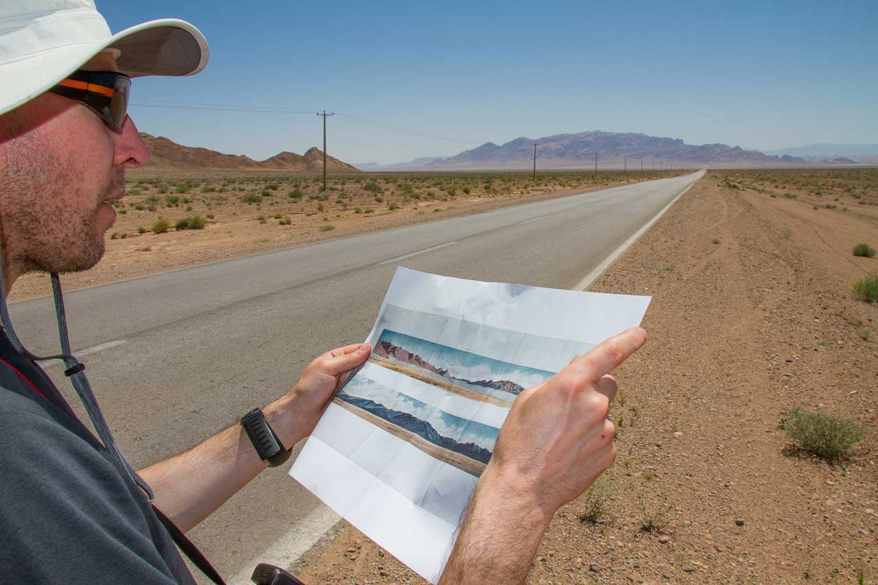 Larsson försöker lokalisera den exakta positionen där Sven Hedin ritade detta panorama i Iran 1906. Foto: Adrian Nordenborg.